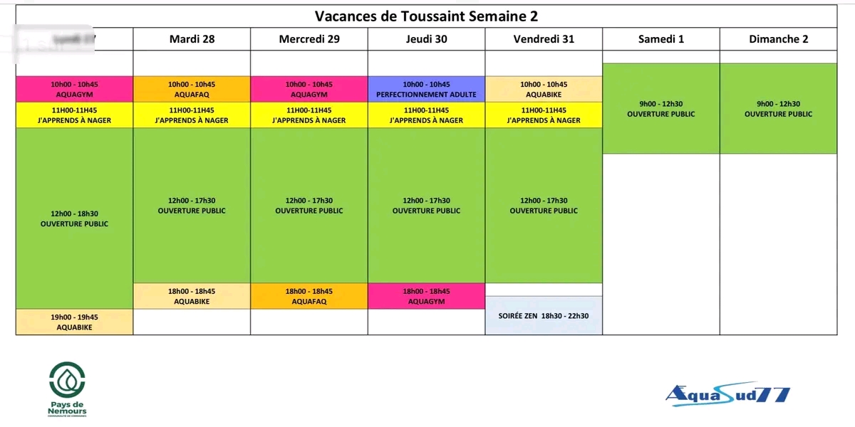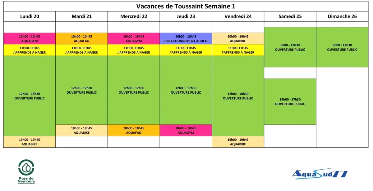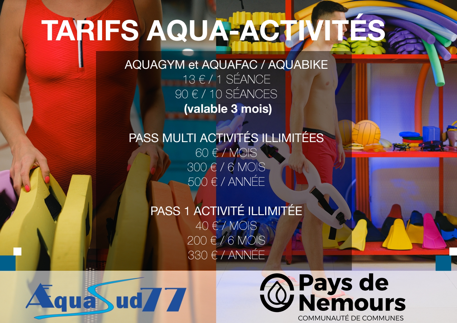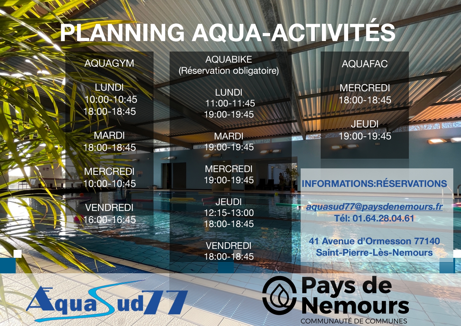 Inscriptions au 01 64 28 04 61 aquasud77@paysdenemours.fr ou sur place, aux horaires d’ouverture au public