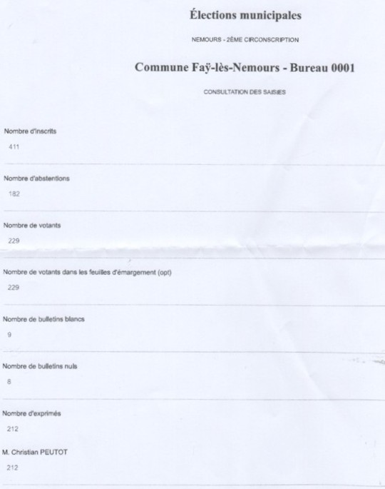 RESULTATS ELECTIONS MUNICIPALESdu 15 mars 2026 Nombre d'inscrits: 411 Nombre de votants: 229 M. Christian PEUTOT 212
